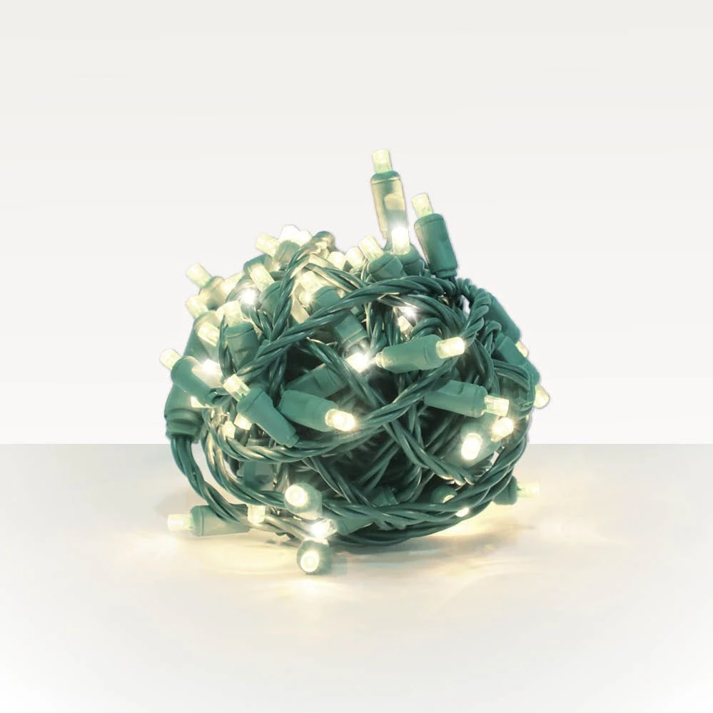5 mm Wide Angle Conical – 70 Bulb Count, 4″ Spacing – 2800K Warm White – Green Wire – Balled